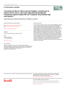 Dussault David, Morissette Olivier et Lecomte Frédéric. (2024). L’invasion du fleuve Saint-Laurent (Québec, Canada) par la tanche (Tinca tinca) : que nous apprend l’historique de l’expansion spatio-temporelle sur l’ampleur du problème qui nous guette? Le Naturaliste canadien, 148, (2), p. 23-38.