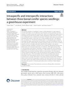 Marty Charles, Baudry Lona, Paula Ranieri Ribeiro, Fradette Olivier et Faubert Patrick. (2025). Intraspecific and interspecific interactions between three boreal conifer species seedlings: a greenhouse experiment. Discover Forests, 1, (30), p. 1-17.
