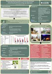 The main objectives of this Living Lab are to: (a) identify key mental health challenges within Quebec (Canada) university communities; (b) explore actions, initiatives, and resources that support community mental health; (c) implement new mental health promotion initiatives; and (d) evaluate their impact. This presentation, based on a Canadian case study, provides an overview of the Living Lab’s four years of activity, drawing on the results of three research projects conducted during this period.