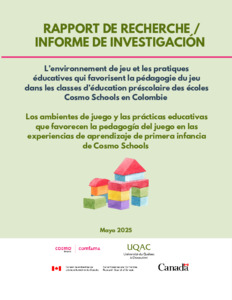 Jacob Elisabeth, Piedrahita Maria Victoria Alzate, Gomez Miguel Angel, Lehrer Joanne, Pulido Loïc, Ritchie Jenny, Sanchez Caro Carmen, Smith-Gilman Sheryl, Skelling-Desmeules Marie-Ève et Vieira-Posada Gabriel Jaime. (2025). L'environnement de jeu et les pratiques éducatives qui favorisent la pédagogie du jeu dans les classes d'éducation préscolaires des écoles Cosmo Schools en Colombie / Los ambientes de juego y las prácticas educativas que favorecen la pedagogía del juego en las experiencias de aprendizaje de primera infancia de Cosmo Schools. Université du Québec à Chicoutimi, CNRH, Cosmo Schools.