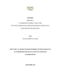 Sanni Olaitan Sabitiyou. (2025). Impact de la variable macroéconomique technologique sur le comportement de recyclage du plastique des consommateurs. Mémoire de maîtrise, Université du Québec à Chicoutimi.