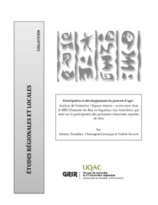 Tremblay Sabrina, Lévesque Christophe et Savard Valérie. (2024). Participation et développement du pouvoir d’agir : Analyse de l’initiative « Espace citoyen » ayant cours dans la MRC Domaine-du-Roy au Saguenay–Lac-Saint-Jean, qui mise sur la participation des personnes citoyennes expertes de vécu. GRIR.